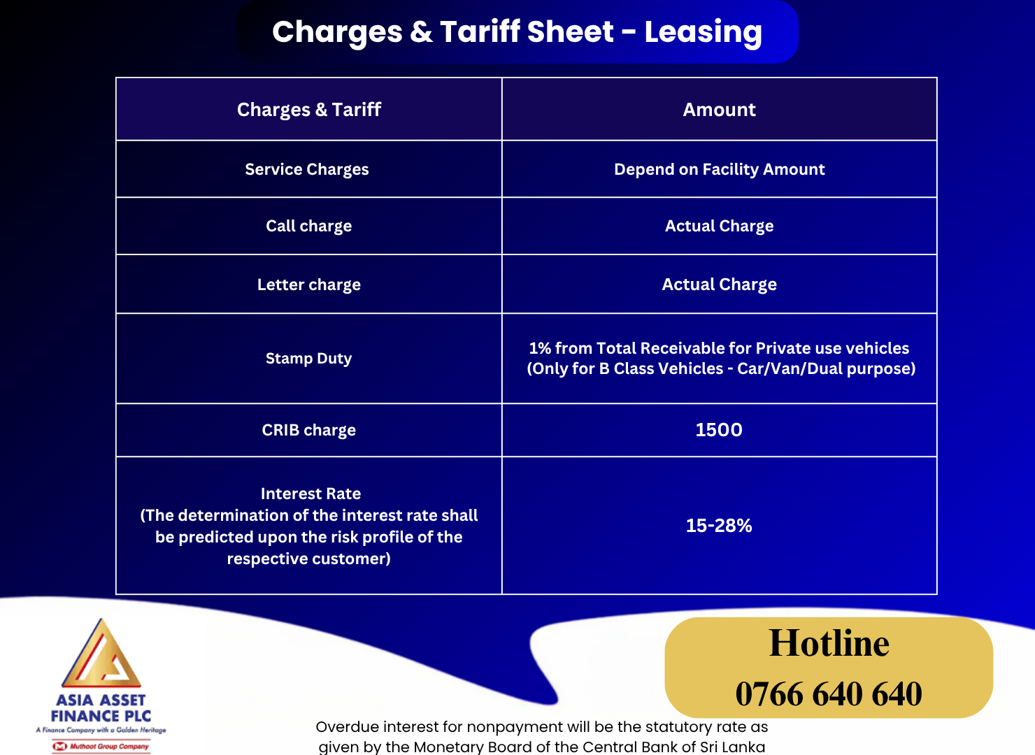 Don’t let anyone tell you that you should not drive your dream vehicle NOW! Any vehicle you could have possibly wanted to drive or ride is just one visit to your nearest Asia Asset Branch away. Own it. Drive it. And all the time in the world to pay for it. In this deal, you WIN! When you apply for a lease from us our trained professionals will provide you with; The finest interest rates in the market, Doorstep Service, Minimum Documentation, Zero Hassle, Flexible Repayment Terms & etc. So, lease with ease with us and drive your dream!